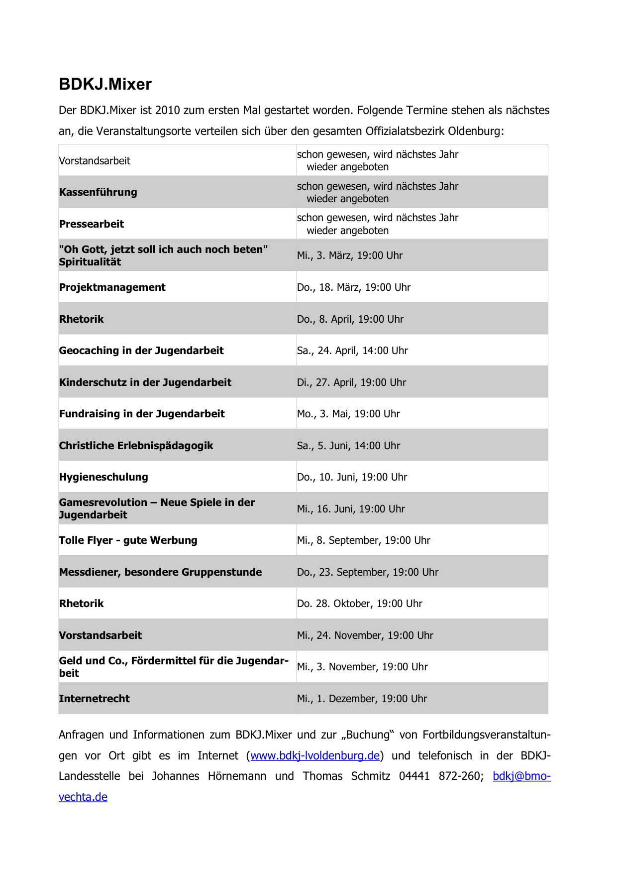 Eine Übersicht über kommende Termin gibt es hier oder direkt unter www.bdkj-lvoldenburg.de und telefonisch in der BDKJ-Landesstelle bei Johannes Hörnemann und Thomas Schmitz 04441 872-260; bdkj{auf}bmo-vechta{punkt}de