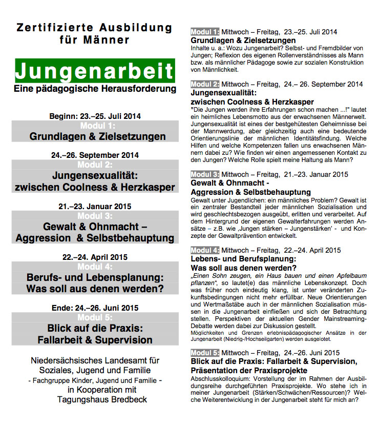 Jungen sind eine Gruppe der sozialen Arbeit, die sich vielfältig zeigt. Um mit ihnen in einen arbeitsfähigen Kontakt zu gehen, bedarf es einer reflektierten und bewussten pädagogischen Herangehensweise. [mehr]