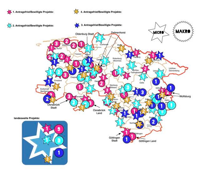 Die Antragsfristen sind im Jahr 2011 so eingerichtet, dass eine monatliche Antragstellung möglich ist. Jeweils zum ersten des Monats Enden die Fristen und die Anträge werden geprüft. Wir wollen damit eine höhere Flexibilität schaffen und spontanen Anträgen mehr Raum geben. Zu den 138 Projekten sollen noch einige auf der Landkarte hinzukommen!