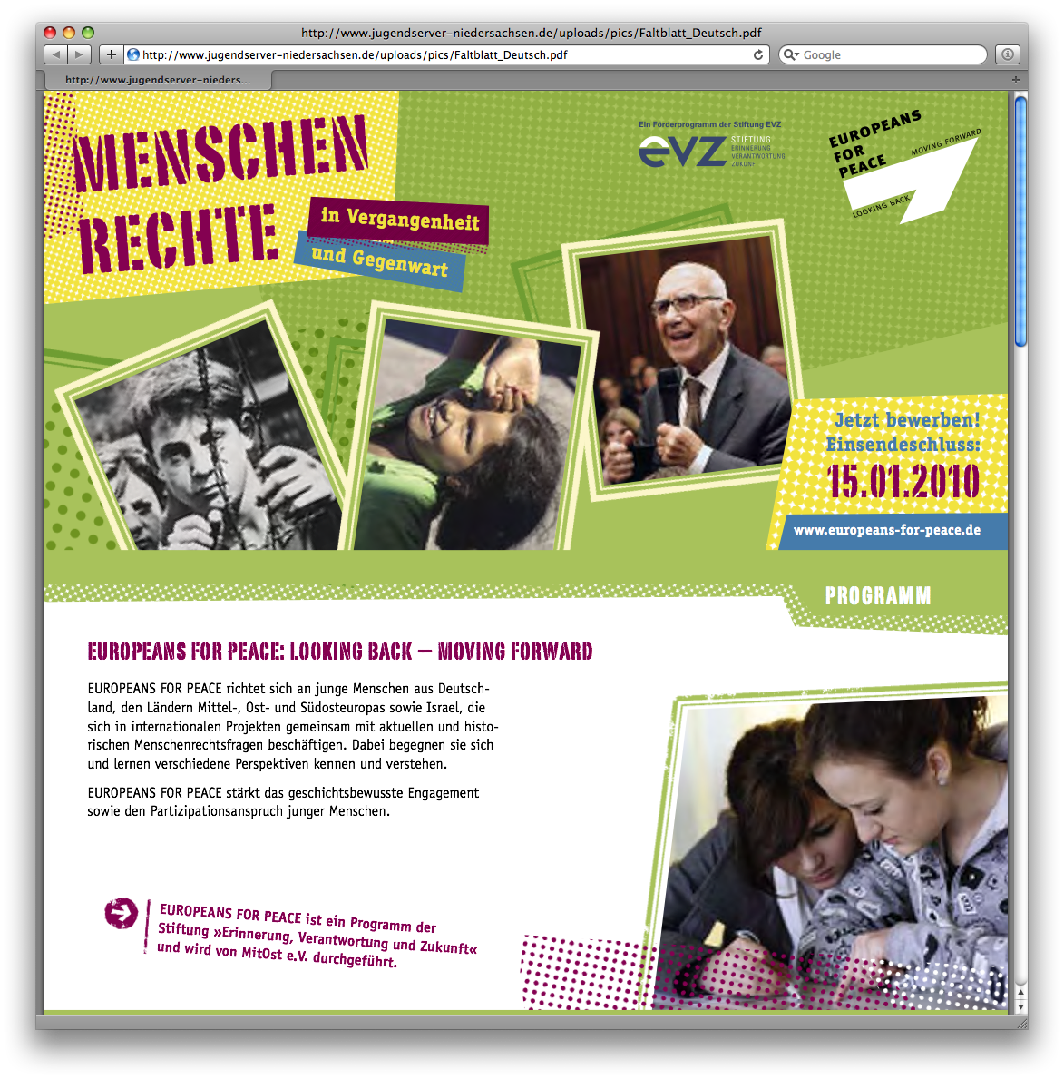 EUROPEANS FOR PEACE ist ein Förderprogramm für internationale Jugendprojekte der Stiftung »Erinnerung, Verantwortung und Zukunft« zur Förderung des geschichtsbewussten Engagements junger Menschen. [mehr]