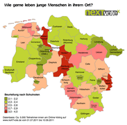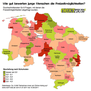 Fast 5.000 Jugendliche hatten in den vergangenen zwei Monaten ihren Wohnort bewertet gefragt wurde insbesondere nach den Freizeitmöglichkeiten nach der Schul- und Ausbildungssituation und nach den Beteiligungsmöglichkeiten. Positiv beurteilt werden dabei vor allem die nichtkommerziellen Freizeitangebote der Jugendverbände und die Sportmöglichkeiten; diese werden im landesweiten Durchschnitt mit 2,9 bzw. 2,6 bewertet; deutlich schlechter werden hingegen die kommerziellen Freizeitangebote (Kino, Konzerte, Bistros,...) beurteilt.