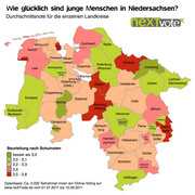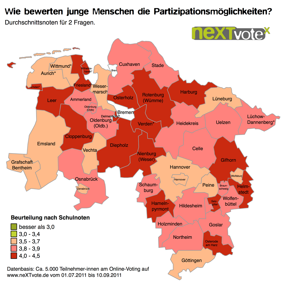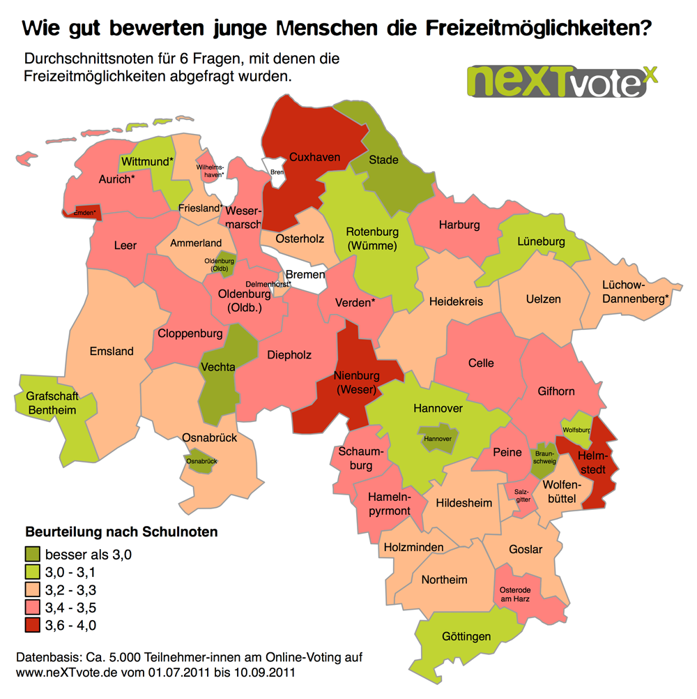 Die nun vom Landesjugendring Niedersachsen e.V. veröffentlichten glüXkarten illustrieren anschaulich, wie junge Menschen in Niedersachsen die Lebensqualität ihres Wohnortes einschätzen.