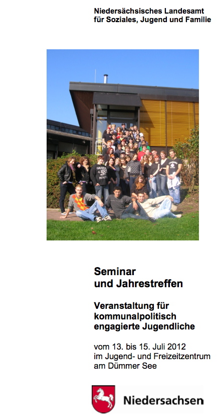 Das Niedersächsisches Landesamt für Soziales, Jugend und Familie veranstaltet ein Seminar und Jahrestreffen für kommunalpolitisch engagierte Jugendliche vom 13. bis 15. Juli 2012 im Jugend- und Freizeitzentrum am Dümmer See.[mehr]