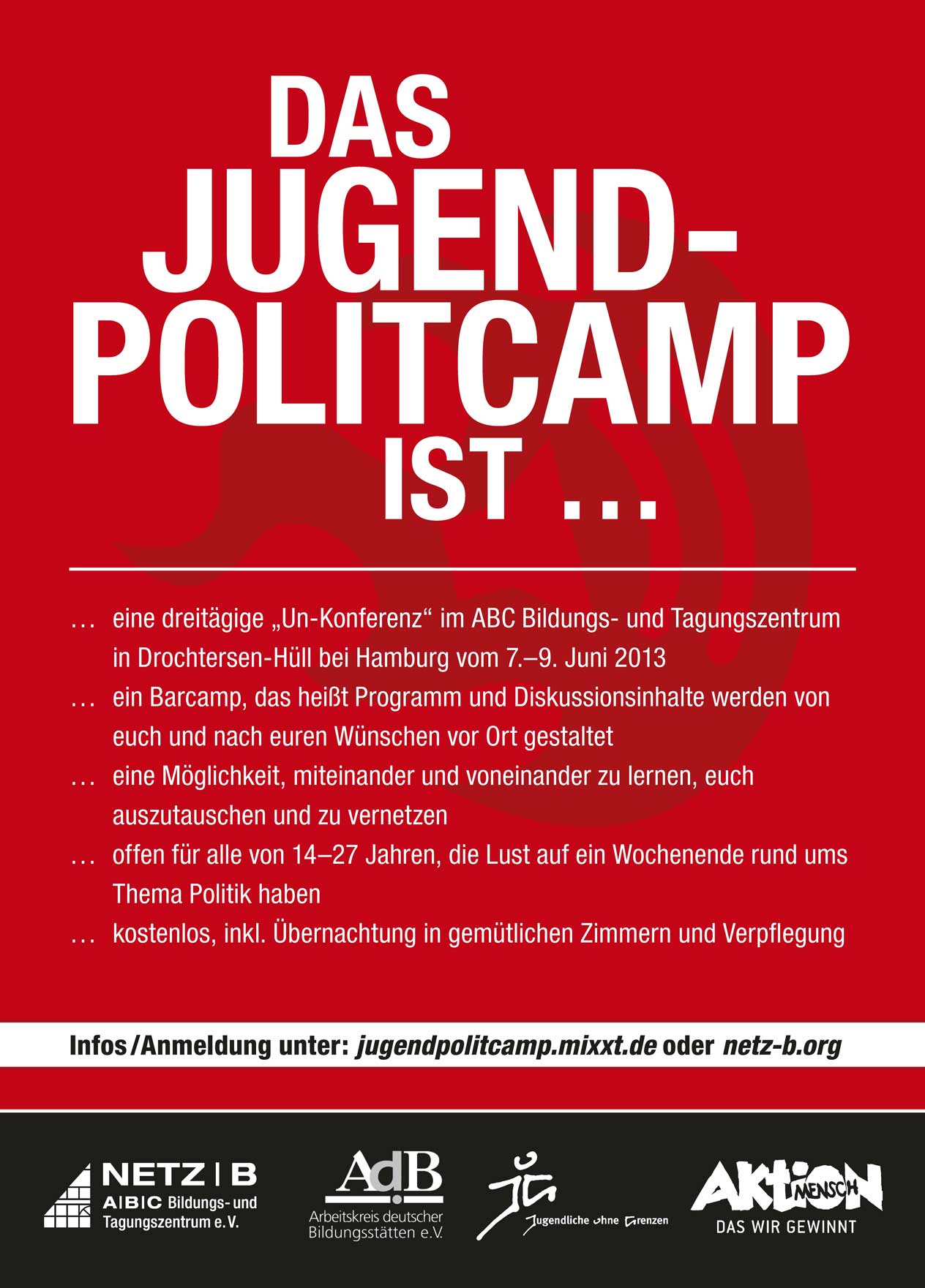 Das Projekt Netz-B, in dessen Rahmen das JugendPolitCamp stattfindet, sieht vor, dass Jugendliche selbst die Veranstaltung mit organisieren, um ihnen eine Veranstaltung nach ihren Bedürfnissen zu ermöglichen. Wir sind ein kleines Team von jungen Leuten, die gemeinsam das JugendPolitCamp organisieren.