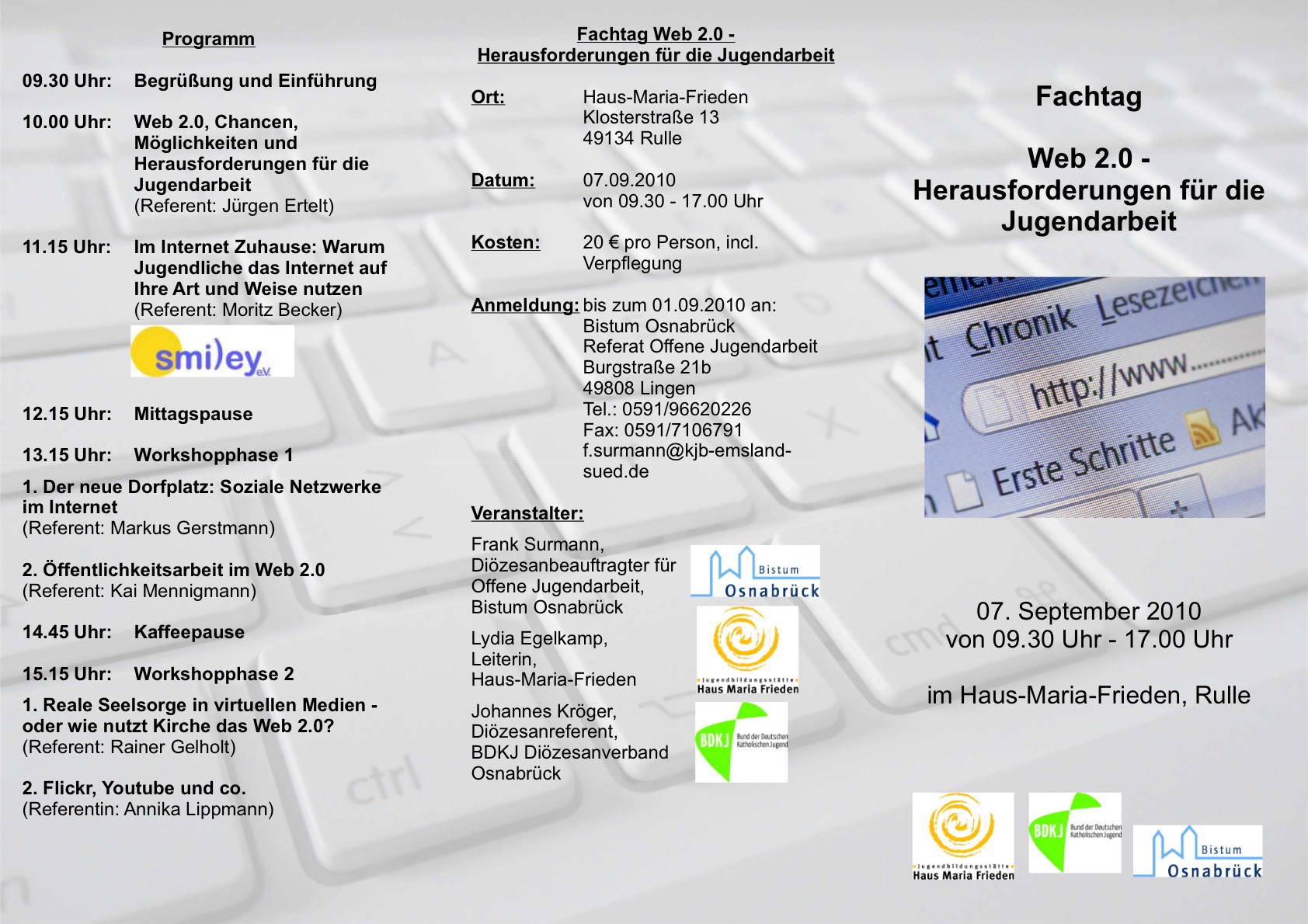 Welche Herausforderungen für die Jugendarbeit mit dem Internet und besonders dem WEB 2.0 verbunden sind, wird auf einer Tagung am 7. September im »Haus Maria Frieden« in Wallenhorst-Rulle erörtert.[mehr]