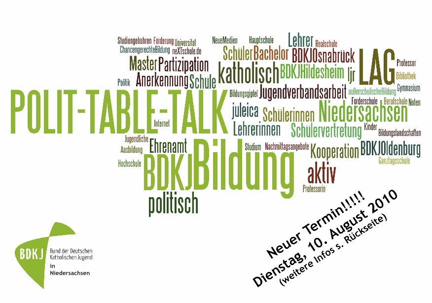 Der BDKJ in Niedersachsen veranstaltet am 10. August 2010 ab 18 Uhr einen Polit-Table-Talk in der Familienbildungsstätte in Osnabrück.[mehr]