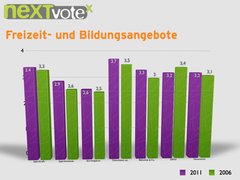 Positiv beurteilt werden dabei vor allem die nichtkommerziellen Freizeitangebote der Jugendverbände und die Sportmöglichkeiten; diese werden im landesweiten Durchschnitt mit 2,9 bzw. 2,6 bewertet.