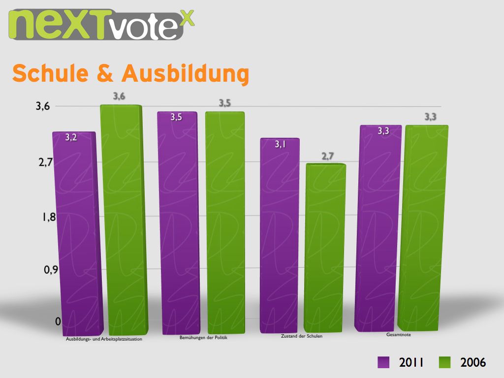 Auffällig dabei ist, dass die Beurteilungen aus dem Jahr 2011 im Landesdurchschnitt bei fast allen Fragen schlechter ausfallen als 2006 lediglich der ÖPNV und die Ausbildungs- und Arbeitsplatzsituation werden 2011 besser beurteilt als vor 5 Jahren.