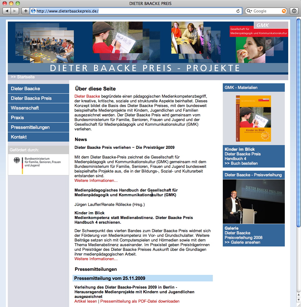 Mit dem Dieter Baacke-Preis zeichnen die Gesellschaft für Medienpädagogik und Kommunikationskultur (GMK) und das Bundesministerium für Familie, Senioren, Frauen und Jugend seit 2001 beispielhafte Projekte der Bildungs-, Sozial-...[mehr]
