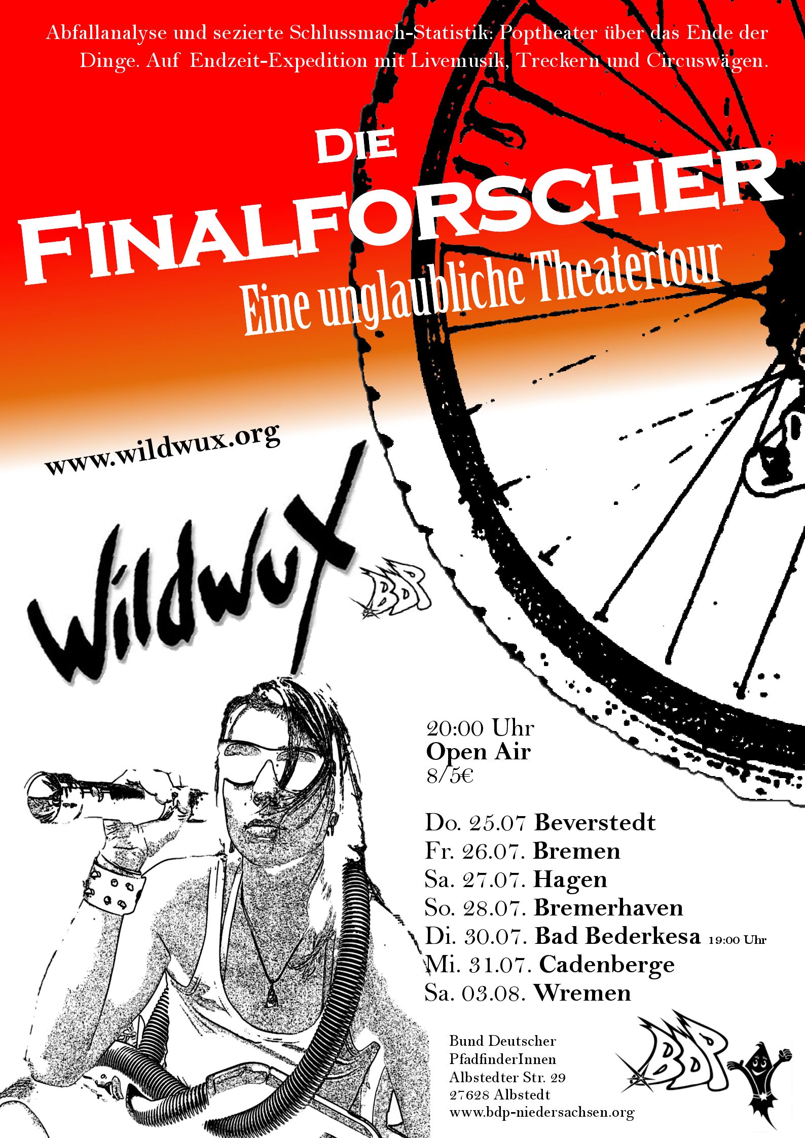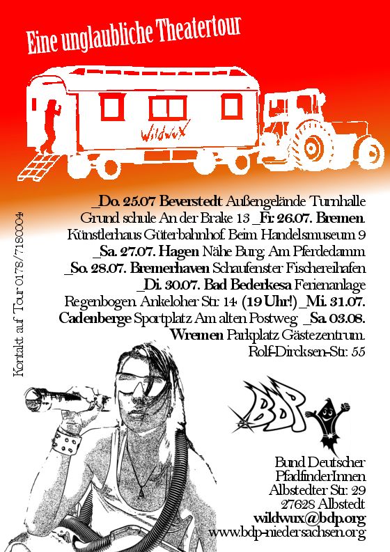 Die BDP-Theaterpfadfinder_innen von WildwuX gehen dieses Jahr auf Tour durch 7 Orte in der norddeutschen Tiefebene. Mit 25 km/h zieht WildwuX seine Circuswagen, in denen das 12-köpfige Ensemble während der Tour im Sommer zusammenlebt.