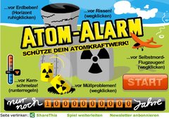 Jetzt landet eines der wichtigsten Wahlkampfthemen - der Streit um die Atomenergie - auch als Internet- und Handyspiel auf Bildschirmen und Mobiltelefonen von Spieleliebhabern. "Atom-Alarm", so der Name des Spiels, erfordert volle Aufmerksamkeit, nachdem die Aufforderung "Schütze Dein Atomkraftwerk!" an den Spieler ergangen ist.
