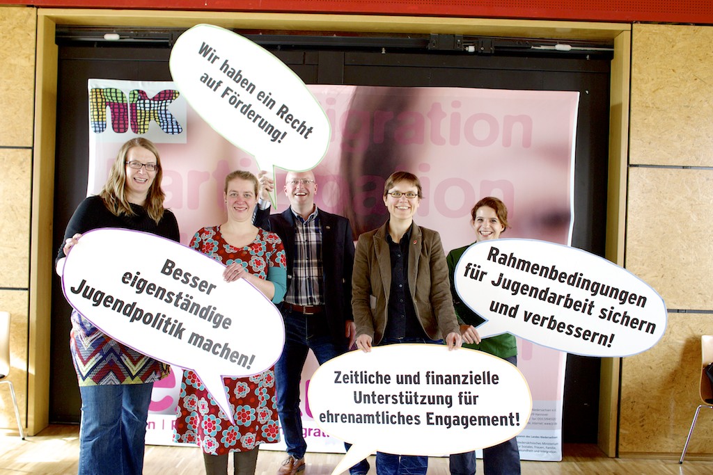 Die wiedergewählten Mitglieder des LJR-Vorstands, Jens Risse (Vorstandssprecher, Bund der Deutschen Katholischen Jugend Niedersachsen), Susanne Martin (Schatzmeisterin, Deutsche Schreberjugend Niedersachsen), Kerstin Pätzold (DGB-Jugend) und Hannah Gundert (DLRG-Jugend Niedersachsen) sowie Katrin Müller (Arbeitsgemeinschaft der Evangelischen Jugend Niedersachsen), die neu in den Vorstand gewählt wurde, betonten die Wichtigkeit, gemeinsam mit den Jugendverbänden die Interessen der Kinder und Jugendlichen in Niedersachsen in allen politischen Prozessen in den Vordergrund zu stellen.
