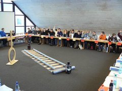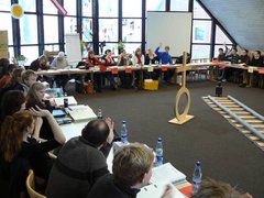 Die Mitglieder waren zur 1. Fahrt des »Kammer-Express« eingeladen. Das Bild der Eisenbahn prägte den gesamten Verlauf der dreitägigen Zusammenkunft. Der Start war am Freitagabend mit einer ersten Fahrt durch die hannoversche Landeskirche und diente dem gemeinsamen Kennenlernen und dem Austausch über die jeweilige Arbeit vor Ort. Das Landesjugendpfarramt als »Service-Team« sorgte für das leibliche Wohl der Zugreisenden im »Kammer-Express«. Das anschließende Treffen der Ehrenamtlichen diente zur Vergewisserung der zukünftigen Arbeit, der Aufgaben und Rolle als Mitglied in der Landesjugendkammer und fand seinen informellen Ausklang beim gemütlichen Zusammensein, bei dem erste intensivere Kontakte geknüpft, das Kennen lernen vertieft und der gemeinsame Austausch voran gebracht wurden. Am Samstagmorgen wurden einerseits Aufgaben und Befugnisse der Landesjugendkammer behandelt und andererseits sich darüber verständigt »wie der neue Geist der Landesjugendkammer« mit entsprechenden Inhalten und Rahmenbedingungen ausgestaltet werden kann. Zuvor hatten Oberlandeskirchenrätin Dr. Kerstin Gäfgen-Track aus landeskirchlicher Sicht acht Herausforderungen an die Arbeit mit Kinder und Jugendlichen in die Diskussionsrunde eingetragen und der Direktor des Hauses kirchlicher Dienste Ralf Tyra seine Vorstellungen zur Zusammenarbeit und Vernetzung benannt.