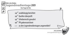 Anmeldeschluss ist der 22. April. Das dauert dir noch zu lang? Dann diskutiere schon jetzt deine Ansprüche an die Medienethik in der Gruppe »Jugendmedientage 2009« auf www.jugendmedien.de