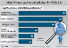 Die BITKOM-Umfrage zeigt, dass sich soziale Netzwerke bei der Personalsuche neben den Internet-Jobbörsen und der eigenen Homepage als drittes Online-Medium etablieren. Insbesondere große Unternehmen nutzen das Web 2.0 für die Rekrutierung neuer Mitarbeiter. 58 Prozent der Unternehmen mit mehr als 500 Mitarbeitern veröffentlichen Stellenanzeigen in sozialen Netzwerken, während es bei kleinen und mittelständischen Firmen erst 29 Prozent sind. Unterschiede gibt es auch zwischen den Branchen: Bereits 41 Prozent der befragten ITK-Unternehmen nutzen das Web 2.0 bei der Personalsuche, aber erst 16 Prozent der Baufirmen.
