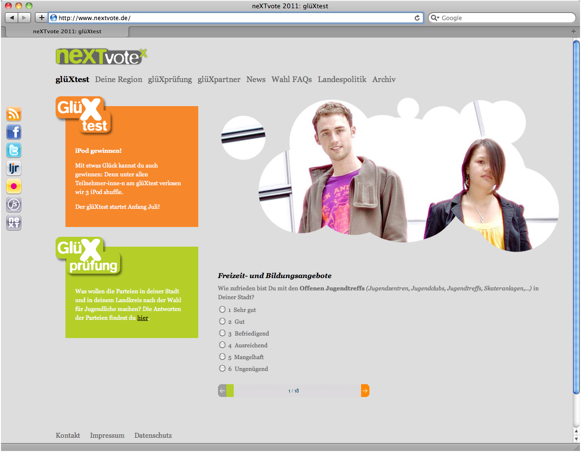 Die zur Wahl stehenden Parteien sind außerdem aufgefordert, sich im Rahmen der "glüXprüfung" auf neXTvote.de zu jugendpolitischen Fragestellungen zu positionieren, so dass sich die Wählerinnen und Wähler dann auf der Webseite über die Ziele der verschiedenen Parteien informieren und online den Kontakt zu den Parteien suchen können.