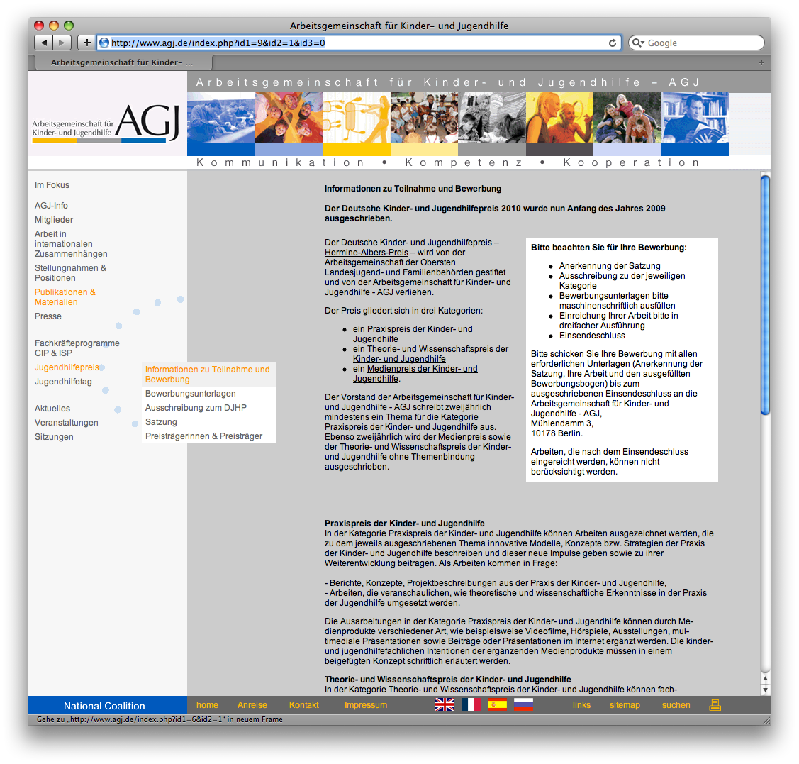Die Arbeitsgemeinschaft für Kinder- und Jugendhilfe AGJ schreibt den Deutschen Kinder- und Jugendhilfepreis 2010 Hermine-Albers-Preis in den Kategorien Praxispreis, Theorie- und Wissenschaftspreis sowie Medienpreis der...[mehr]