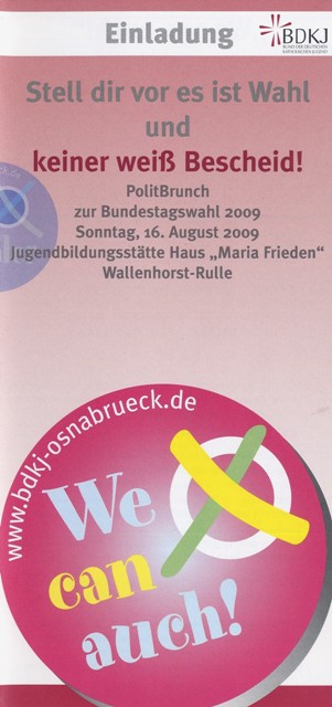 Der Bund der Deutschen Katholischen Jugend (BDKJ) im Bistum Osnabrück lädt Jugendliche und junge Erwachsende zu einem PolitBrunch am 16. August 2009 in die Jugendbildungsstätte Haus »Maria Frieden« in Wallenhorst-Rulle ein.[mehr]