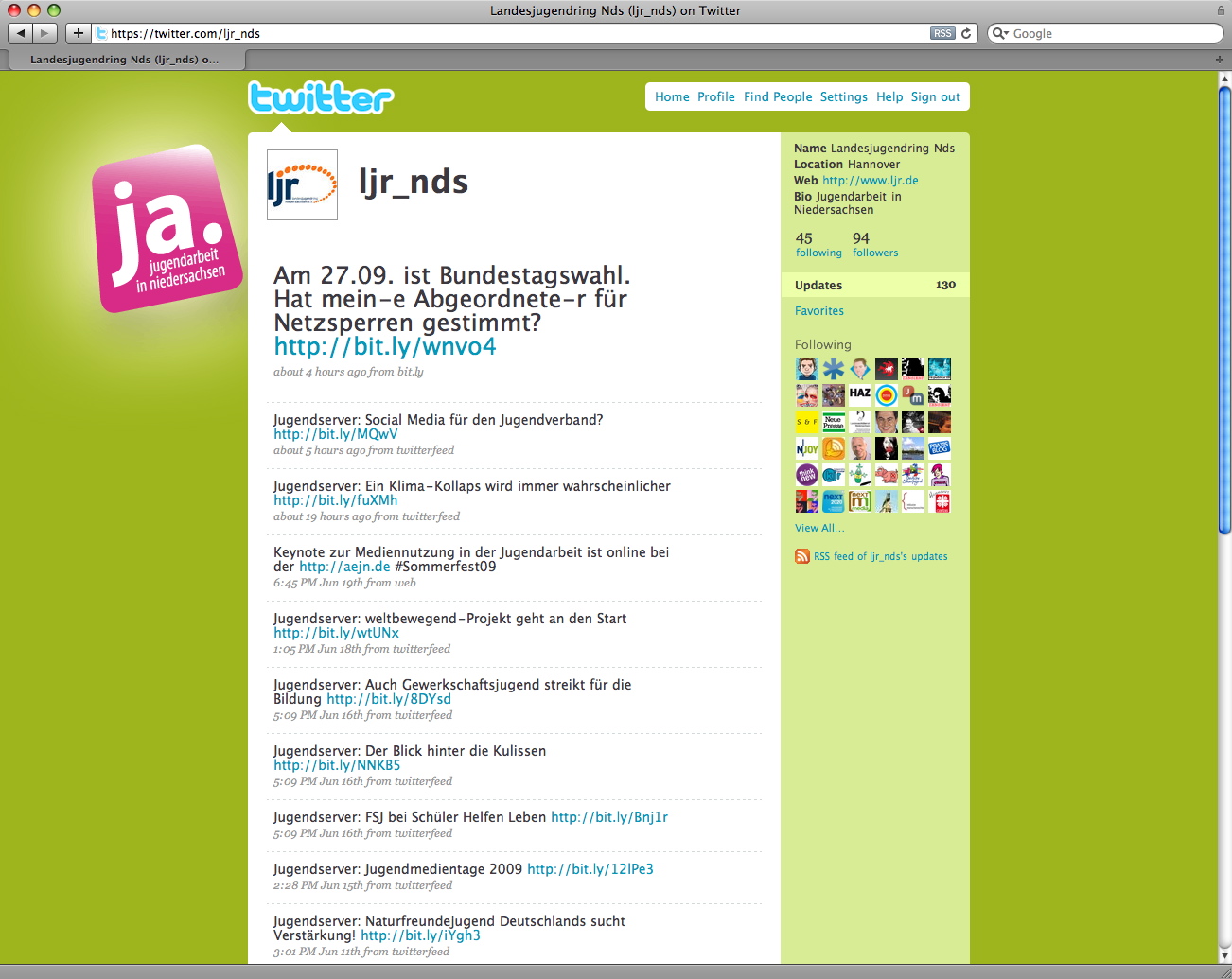 Neben der qualifizierten Aufbereitung von Social Media Tools, z. B. in der dreimal im Jahr erscheinenden Zeitschrift »korrespondenz« betreibt der Landesjugendring Niedersachsen aktiv eigene Kanäle im Web 2.0:
