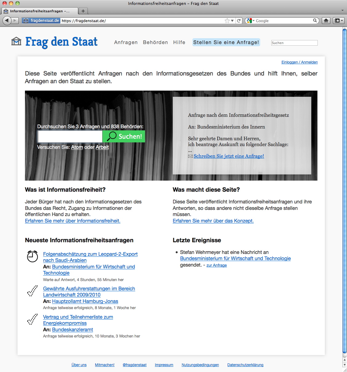 Das von der Open Knowledge Foundation Deutschland e.V. betriebene Internetportal »Frag den Staat" ist heute online gegangen. [mehr]