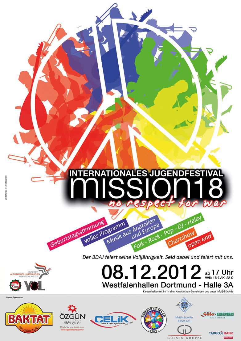 Am 08. Dezember 2012 feiert der Bund der Alevitischen Jugendlichen in Deutschland e.V. (BDAJ) sein 18-jähriges Bestehen (Volljährigkeit) mit einem großen internationalen Jugendfestival.[mehr]