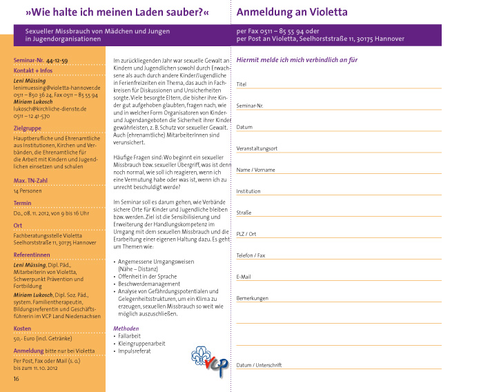 Der VCP Niedersachsen bietet am 08.11.2012 ein Seminar zusammen mit der Beratungsstelle Violetta unter dem Titel „Wie halte ich meinen Laden sauber? Sexueller Missbrauch von Mädchen und Jungen in Jugendorganisationen" an.[mehr]