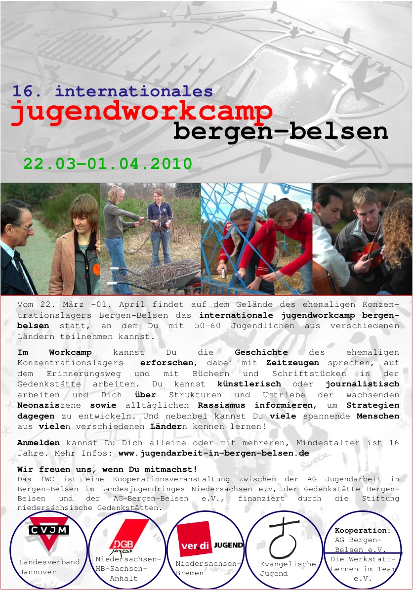 Vom 22. März -01. April findet auf dem Gelände des ehemaligen Konzentrationslagers Bergen-Belsen das 16. Internationale Jugendworkcamp Bergen-Belsen statt, an dem du mit 50-60 Jugendlichen aus verschiedenen Ländern teilnehmen...[mehr]
