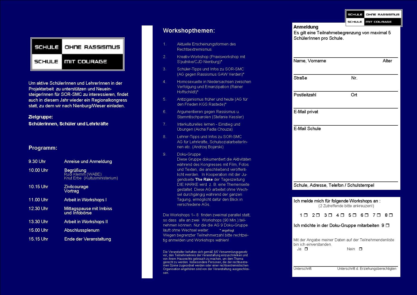 Am 16.3.2010 findet in Nienburg im Kulturwerk ab 10 Uhr der Regionalkongress Schule Ohne Rassismus / Schule Mit Courage statt.[mehr]