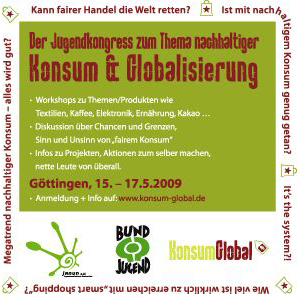 Der Jugendkongress zum Thema nachhaltiger Konsum & Globalisierung steht kurz bevor - Am 15.-17.5. in Göttingen: die Workshops sind eingepackt - eine spannende Mischung mit fitten ReferentInnen! Aktion und Freude inklusive - am Samstag Abend gibt es eine kreative Tour durch Göttingens Innenstadt! 30 der 50 Plätze sind bereits vergeben, also fix Anmelden und dabei sein...