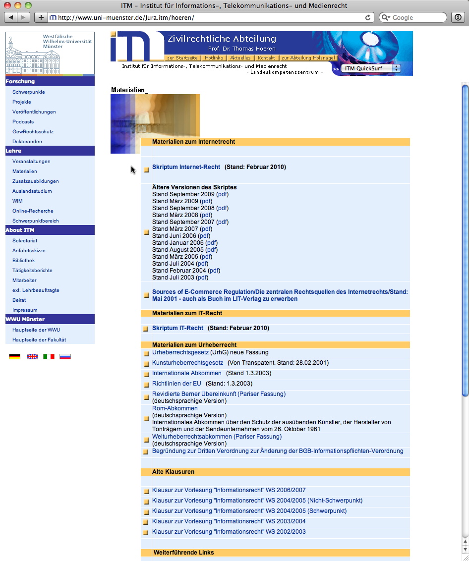 Die aktuelle Ausgabe des Skriptum Internetrecht (September 2010) von Prof. Dr. Thomas Hoeren, am Institut für Informations-, Telekommunikations- und Medienrecht an der Universität Münster ist erschienen![mehr]