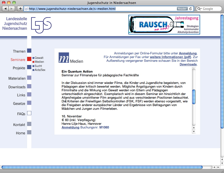 Fachtagung am 08.12.2010 für pädagogische Fachkräfte aus der Jugendarbeit, dem Kinder- und Jugendschutz sowie der Jugendsozialarbeit[mehr]
