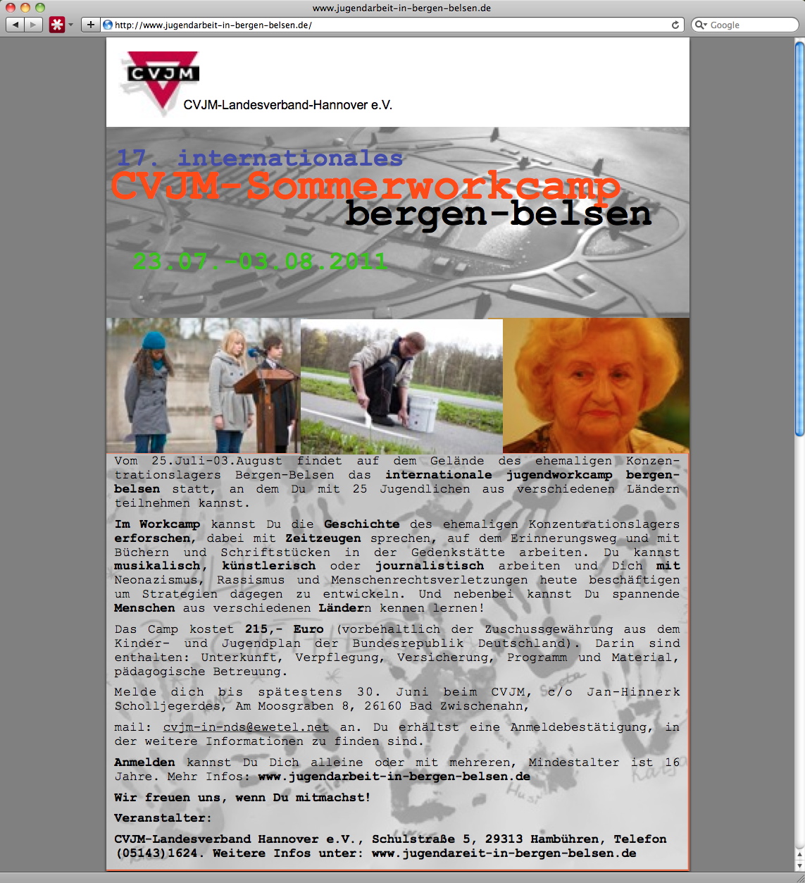 Das diesjährige 17. CVJM-Sommerworkcamp Bergen-Belsen findet vom 25. Juli bis 03. August 2011 auf dem Gelände des ehemaligen Konzentrationslagers Bergen-Belsen statt.