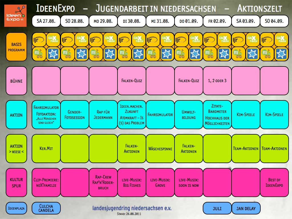 Am ersten Tag der IdeenExpo starten die Basisaktionen im Aktionszelt der Jugendarbeit mit dem GlüXtest, dem Media-Skill-Tester und dem Generation 2.0 IdeenDreh für innovative Projekte in Niedersachsen..