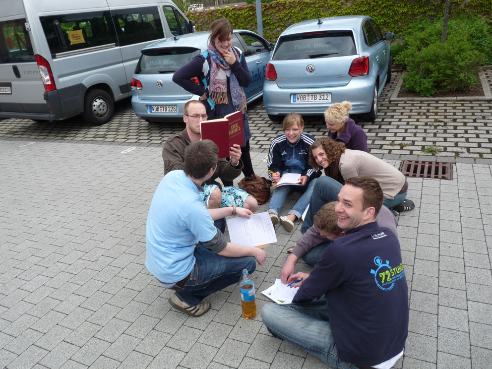 Der Weg von Station zu Station, also die Lösung der jeweils nächsten Etappe, verlangte den Teilnehmerteams einiges ab. Nicht nur konkretes Wissen zu Gebieten wie Geschichte, Theologie, Geographie und Musik war gefragt. Vor allem die kommunikationsfordernden Tagesaufgaben waren es, die MC Heimstatt, die Kreativen 4 (genannt das Hoffnungsteam), die Fahrtfinder, das Team Vollgas im Namen des Herrn, das MilCarTeam und all die anderen schwer gefordert haben. »Wir mussten am Montag zum Beispiel Hoffnungsträger interviewen. Wir sollten also mit Passanten zwischen Wolfsburg und Schulenberg über ihre Hoffnung ins Gespräch kommen«, berichtet Petra Steeger aus dem Team Partypolo. Die fünf wichtigsten Gemeinsamkeiten der evangelischen und der katholischen Christen beschäftigten die Teams am Dienstag. »Mittwoch haben uns zwei Jugendliche auf dem Weg zum Konfirmationsunterricht als Mitbringsel für den ökumenischen Kirchentag ein wunderschönes Bild gemalt« berichtet Tobias Fraas aus dem Team Go Lotti Go, »wir sollten es in München einem kleinen Kind schenken das haben wir natürlich gemacht«.