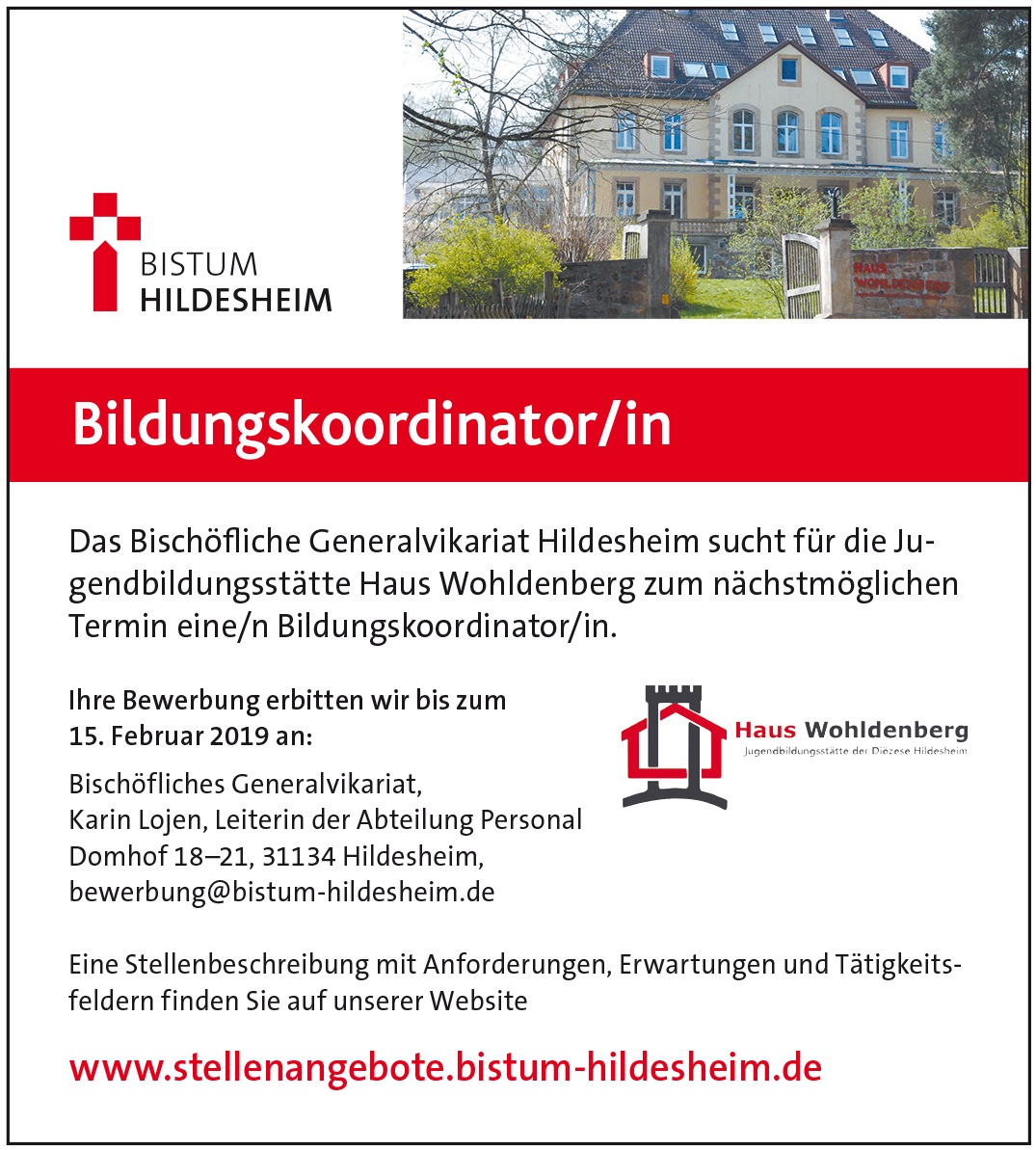 Das Bischöfliche Generalvikariat Hildesheim sucht für die Jugendbildungsstätte Haus Wohldenberg zum nächstmöglichen Termin eine/n Bildungskoordinator/in. Das Haus Wohldenberg in Holle bei Hildesheim ist die zentrale...[mehr]