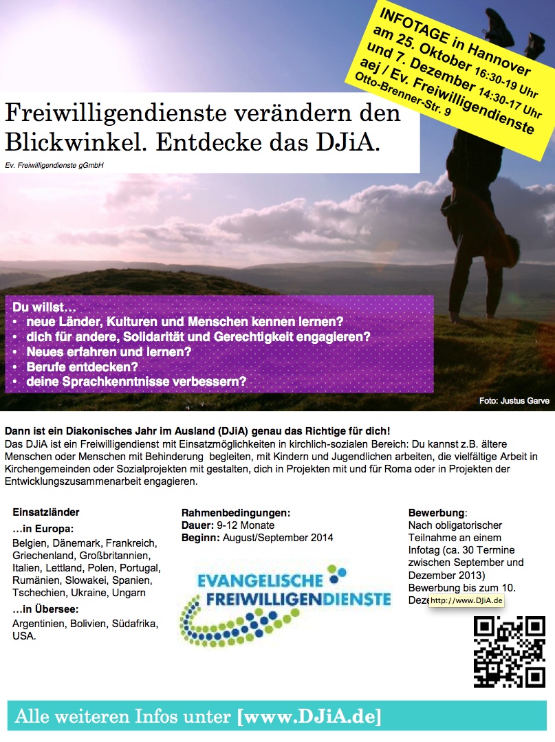 Information und weitere Termine unter www.djia.de, Anmeldung und weitere Infos unter djia{auf}ev-freiwilligendienste{punkt}de oder per Tel. 0511 – 450 00 8340