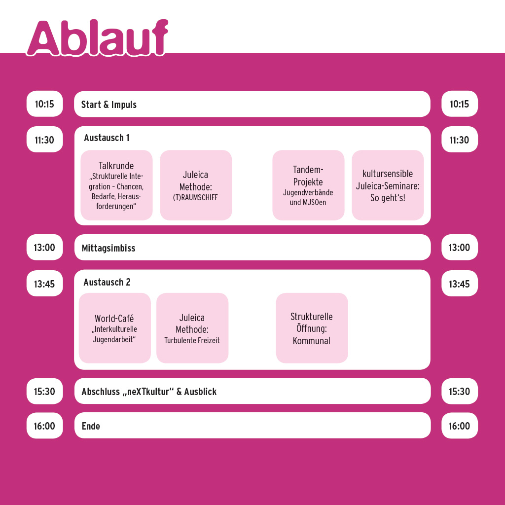 Der Fachtag möchte mit einem spannenden und abwechslungsreichen Programm die kultursensible Weiterentwicklung der Juleica vorantreiben und die strukturelle Öffnung der Jugendarbeit erleichtern. Es erwarten die Teilnehmer-innen Ideen, Methoden, Herausforderungen sowie Best-practise-Beispiele der strukturellen Integration. Außerdem machen wir eine Rückschau auf die letzten zwei Jahre neXTkultur und wagen einen Ausblick auf die nächsten Schritte der von neXTkutur bewegten Themen in der Jugendarbeit Niedersachsens.